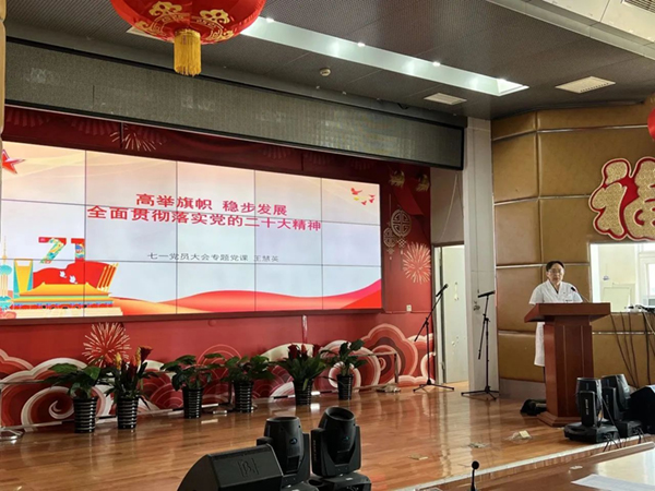 党委副书记、院长王慧英同志在庆七一党员大会上讲授了《高举旗帜 稳步发展 全面贯彻落实党的二十大精神》专题党课,医院领导班子其他成员到所联系支部进行授课,各党支部书记在支部内也分别进行了党课宣讲。