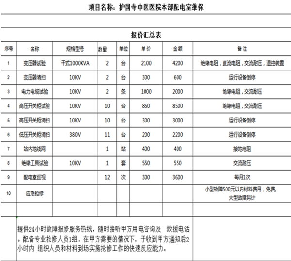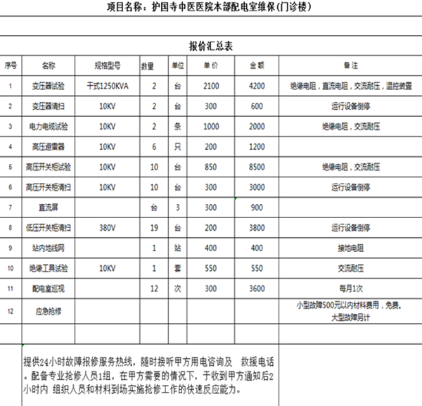 根据医院工作需要,计划对护国寺中医医院本部配电室和门诊楼配电室进行年维保服务。特邀请具有合法资格的单位,按照医院配电室设计相关规范要求,开展我院配电室年维保服务工作。