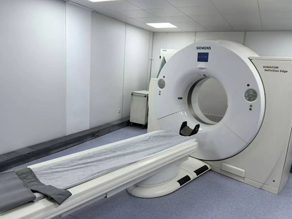 院本部放射科的64排/128层螺旋CT(Definition Edge,德国西门子)适用于头、颈、胸、腹、盆腔、脊柱、四肢等全身各部位的CT平扫与增强检查,比如心脏冠状动脉成像(CCTA)、头颈部动脉血管成像(CTA)、下腹盆腔双下肢动脉与静脉血管成像(CTA与CTV)、肺动脉血管成像(CTPA)、胸部低剂量筛查、颞骨薄层扫描等,图像清晰,能为临床提供全面、可靠的影像学信息。尤其是对炎症、肿瘤以及血管类疾病的早期筛查、发现及早期选择适宜的治疗方案具有不可替代的作用。