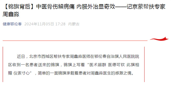 周鑫淼医师积极相应号召积极参与骨科方面的健康宣教工作,先后发表《带您了解腱鞘炎》、《中医骨伤解病痛 内服外治显奇效》宣传文章,对中医骨伤内治法及腱鞘炎的治疗进行宣教工作,文章被鄂伦春自治旗旗人民医院及鄂伦春卫生健康委等多家机构转载,引导当地患者规范化就医诊治疾病。