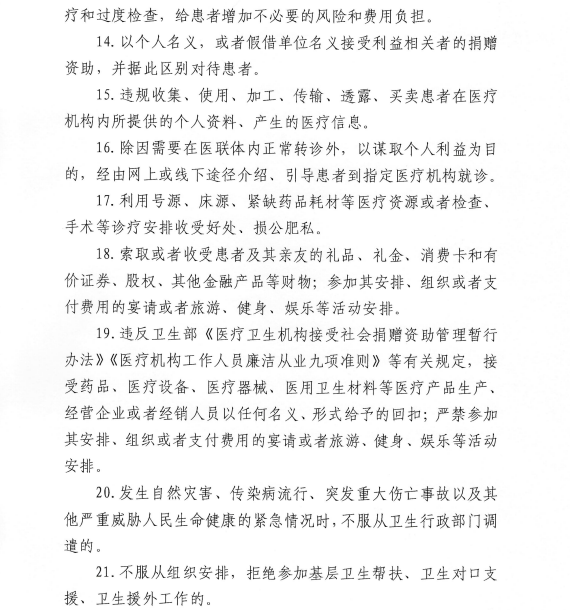 2. 严格遵守《医疗机构工作人员廉洁从业九项准则》,合法按劳取酬,不接受商业提成;严守诚信原则,不参与欺诈骗保;依据规范行医,不实施过度诊疗;遵守工作规程,不违规接受捐赠;恪守保密准则,不泄露患者隐私;服从诊疗需要,不牟利转介患者;维护诊疗秩序,不破坏就医公平;共建和谐关系,不收受患方“红包”;恪守交往底线,不收受企业回扣。
