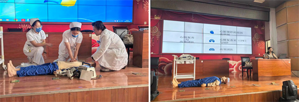 接着,赵丽主任分别就心脏骤停的原因及识别、心肺复苏术(CPR)与AED、人工气道建立以及高效团队协作和CCF的要点进行了详细生动的培训。参加培训的部分医护人员现场进行了团队协作救治的模拟练习,在实践中巩固理论知识、锻炼操作技能。