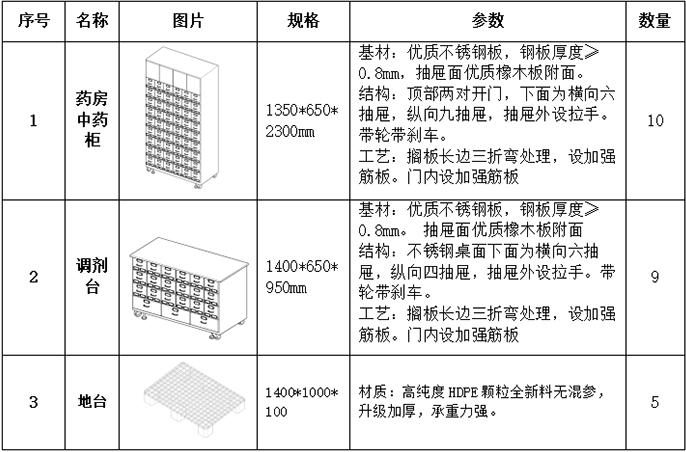 我院新门诊楼已装修改造完毕,拟对药房、药库的货架和药柜进行采购,具体情况如下: