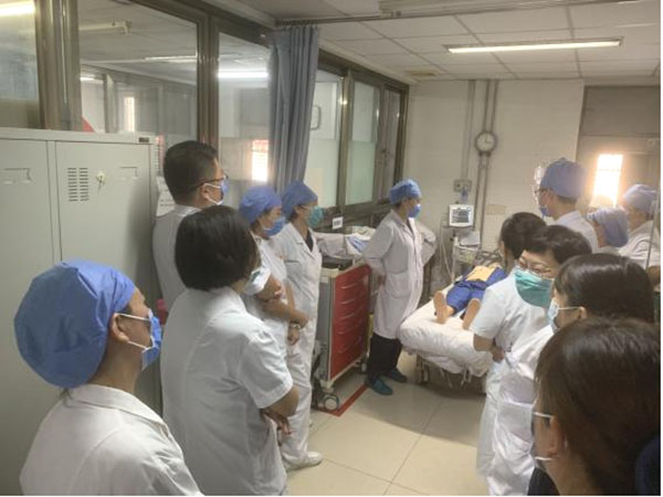 本次演练由医疗主管副院长么丽春、感控主管副院长刘美华以及医务科、门诊办、护理部、感控科共同组成演练专家组,首先对急诊科工作人员开展现场演练、讲评,重点分析本次演练中出现的问题和不足,并在现场开展培训。演练按照预先设定的场景进行,模拟一位老年男性患者,在医院急诊科候诊时突然倒地,出现意识不清,呼吸心跳骤停。科室医护人员发现情况后,迅速反应,展开急救。