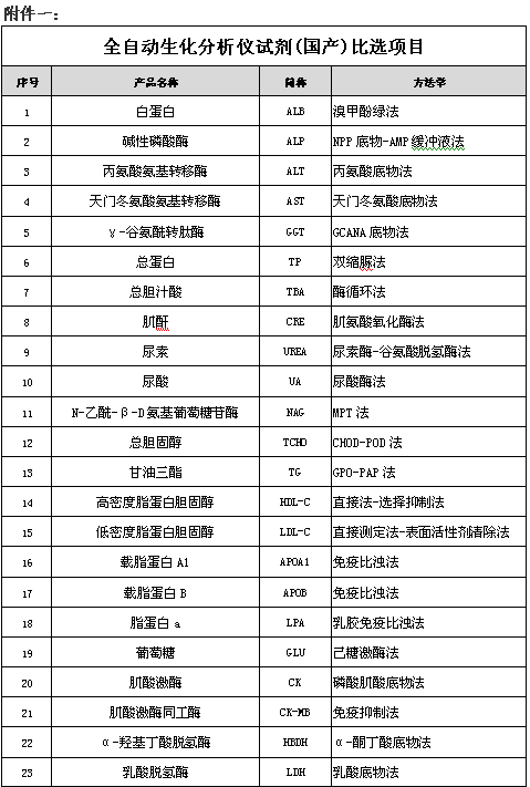 1、项目内容:全自动生化分析仪试剂(国产)一批。(见附件)