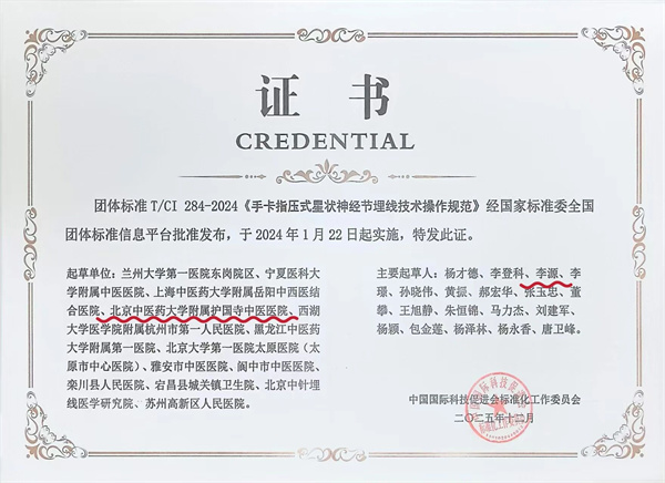 李源医生参与制定《手卡压式星状神经节埋线技术操作》和《迷走神经下神经节埋线技术操作技术》两项团体标准,该治疗方式已在临床中开展使用,深受患者好评。