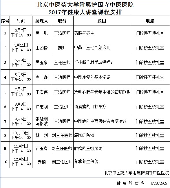 北京中医药大学附属护国寺中医医院 2017年健康大讲堂课程安排