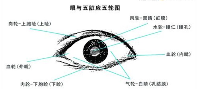 中医认为“五脏六腑之精皆上注于目而为之睛”,“目得血而能视”。眼睛与各个脏腑有着密切联系,细分为眼睑属脾,眼白属肺,大小眼角的血络属心,黑眼仁属肝,瞳孔属肾,称为五轮。
