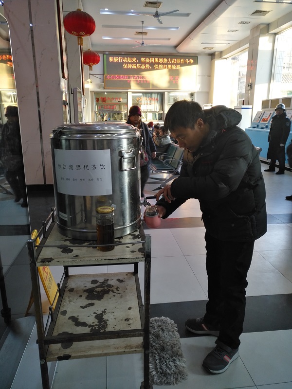 目前我市正处于冬季流感季节,为更好发挥中医药在预防流感、促进群众健康中的作用,根据北京市中医管理局《关于进一步做好中医药防治流感工作的通知》,我院多位临床专家根据今年流感的特性精心组方,幺院长亲自到药房品尝代茶饮的口感并与药剂科马主任反复推敲每一味药的剂量,最终确定了代茶饮处方。中药房的同志们接到任务后立即调配,后勤同志一大早就打好开水,送到大厅,免费提供患者饮用。